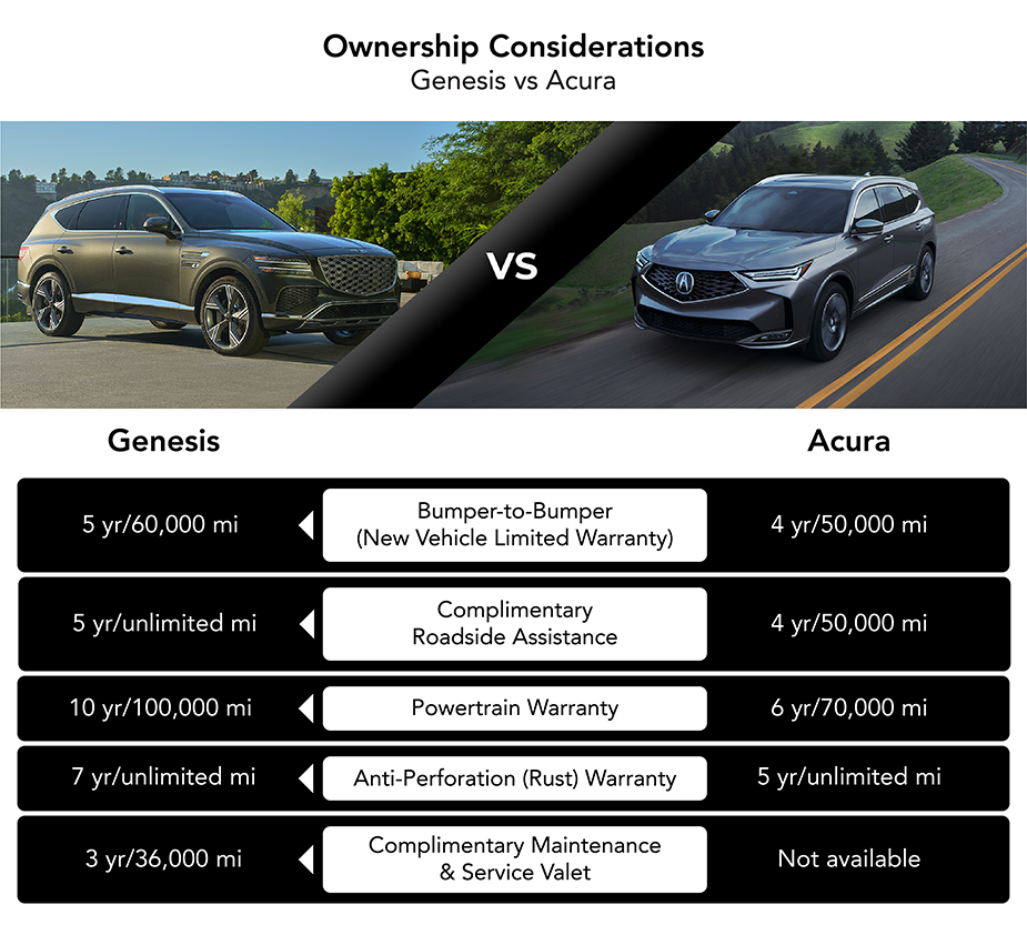 This provides Genesis owners with greater peace of mind and potentially lower ownership costs. Plus when you choose Genesis vs Acura in Chandler, you enjoy complimentary maintenance for up to three years.