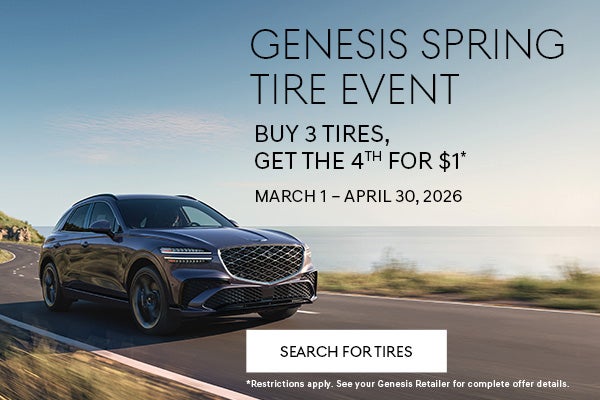 *Offer valid only on select tires. Retailer installation required. May be combined with select offers. Mounting, balancing and taxes not included. Not redeemable for advertised specials, previous purchases or cash. See your Genesis Retailer for complete offer details. Offer expires April 30, 2026.